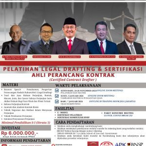 [LGL 105] Pelatihan dan Sertifikasi Perancang Kontrak (Certified Contract Drafter), Pelatihan: 24-26 November 2025 (Online), Sertifikasi 5 Januari 2026 (Online) dan Ujian Sertifikasi 7 Januari 2026 (Tatap Muka)Rp6.000.000Klik Daftar