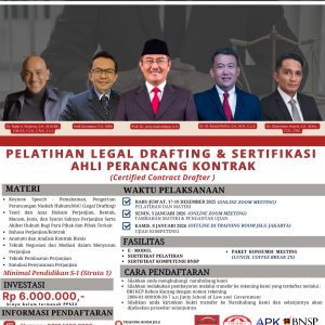 [LGL 106] Pelatihan dan Sertifikasi Perancang Kontrak (Certified Contract Drafter), Pelatihan: 17-19 Desember 2025 (Online), Sertifikasi 5 Januari 2026 (Online), Uji Kompetensi 8 Januari 2026 (Offline)Rp6.000.000Klik Daftar