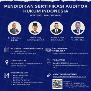 (CLA 160 HYBRID) Pendidikan Sertifikasi Auditor Hukum Indonesia (Kelas Online) 15-17 Desember 2025 dan Uji Kompetensi (Kelas Tatap Muka) 13-14 Januari 2026Rp8.500.000Klik Daftar