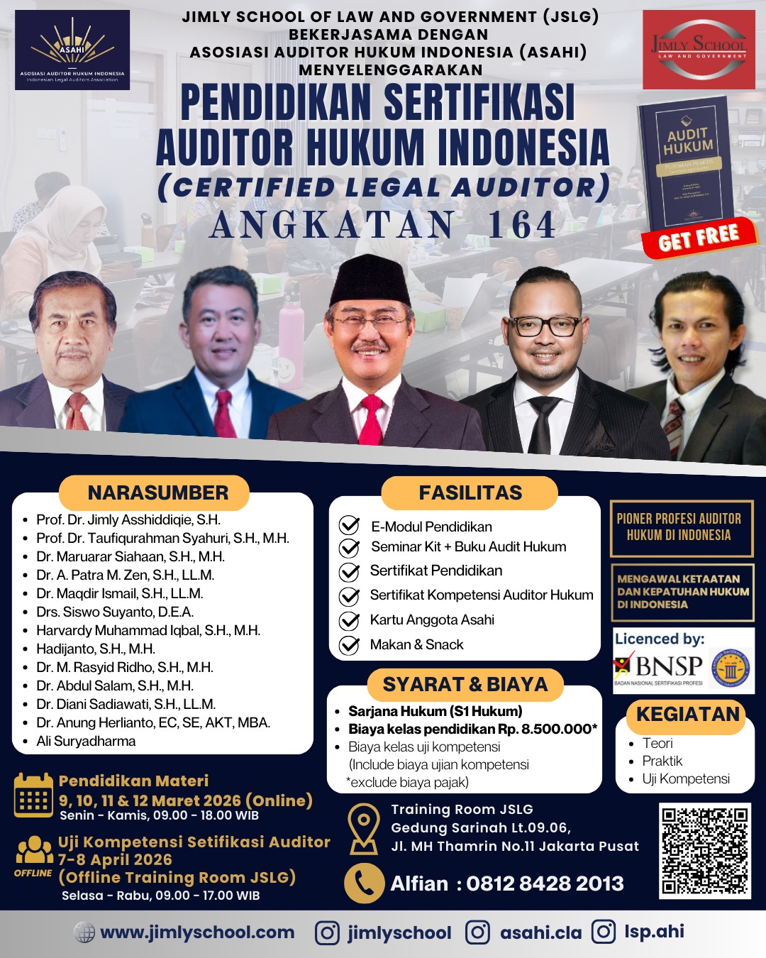 Terkait dengan hal tersebut, ASAHI bekerjasama dengan JSLG menyelenggarakan pendidikan dan uji kompetensi auditor hukum. Dengan adanya kegiatan ini diharapkan para peserta dapat meningkatkan kapasitas dan kompetensinya serta sikap kerja auditor hukum yang berintegritas tinggi.