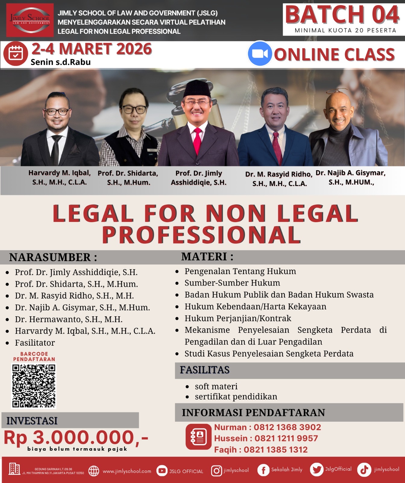 Untuk dapat menyusun legal officer yang baik dan profesional, seseorang perlu memiliki keterampilan (skill) khusus tentang legal officer. Pelatihan Legal For Non Legal ini dirancang dan disiapkan oleh Jimly School of Law and Government (JSLG) untuk menjawab kebutuhan berbagai kalangan agar paham tentang seluk-beluk ilmu hukum dalam praktik bernegara khususnya bisnis.